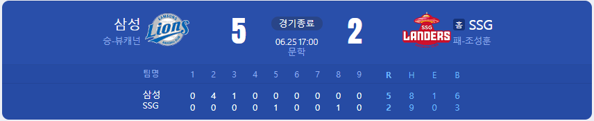 삼성 라이온즈가 SSG 랜더스를 상대로 5 대 2 승리를 가져갑니다.