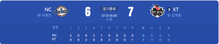 KT 위즈가 NC 다이노스를 상대로 7 대 6 승리를 가져갑니다.