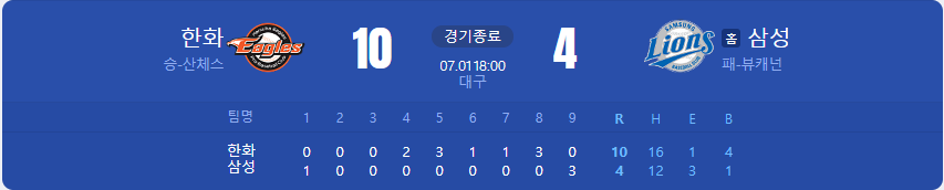 한화 이글스가 삼성 라이온즈를 상대로 10 대 4 승리를 가져갑니다.