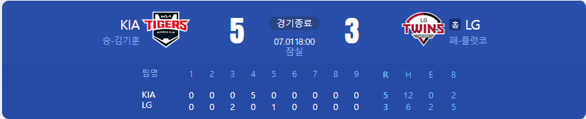 KIA 타이거즈가 LG 트윈스를 상대로 5 대 3 승리를 가져갑니다.