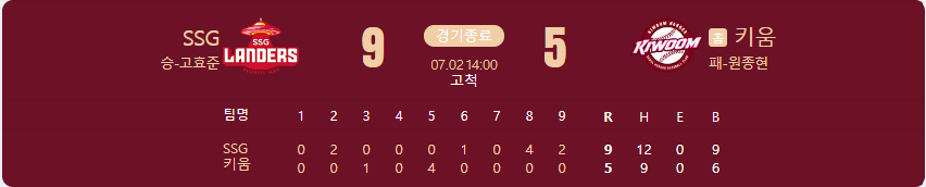 SSG 랜더스가 키움 히어로즈를 상대로 9 대 5 승리를 가져갑니다.