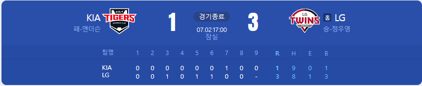 LG 트윈스가 KIA 타이거즈를 상대로 3 대 1 승리를 가져갑니다.