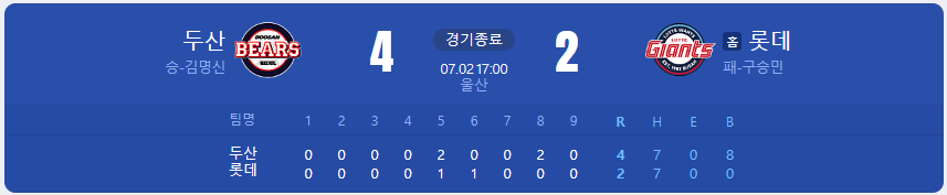 두산 베어스가 롯데 자이언츠를 상대로 4 대 2 승리를 가져갑니다.