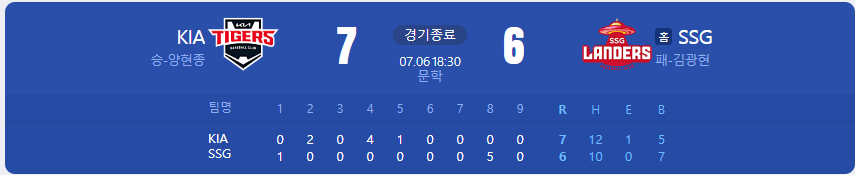 KIA 타이거즈가 SSG 랜더스를 상대로 7 대 6 승리를 가져갑니다.
