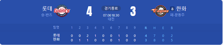 롯데 자이언츠가 한화 이글스를 상대로 4 대 3 승리를 가져갑니다.