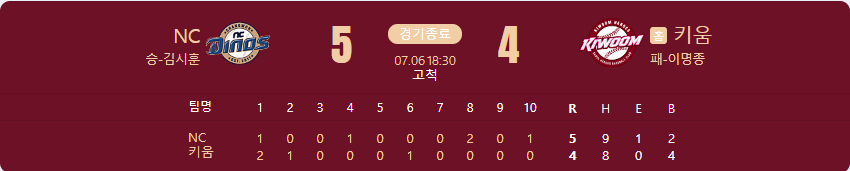 NC 다이노스가 키움 히어로즈를 상대로 5 대 4 승리를 가져갑니다.