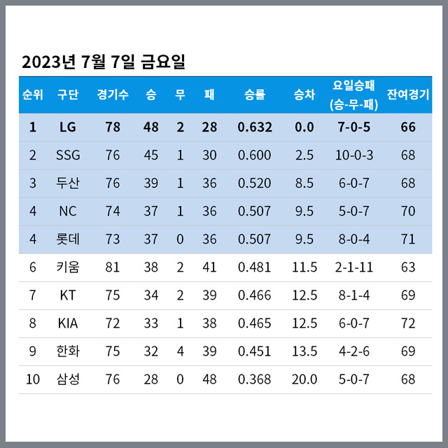 2023년 7월 7일 금요일 정규시즌 순위