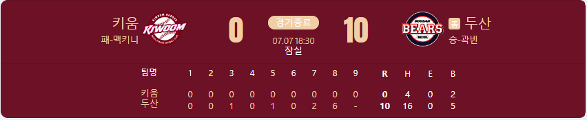 두산 베어스가 키움 히어로즈를 상대로 10 대 0 승리를 가져갑니다.