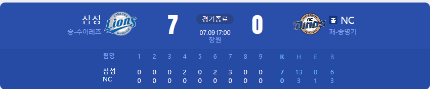 삼성 라이온즈가 NC 다이노스를 상대로 7 대 0 승리를 가져갑니다.