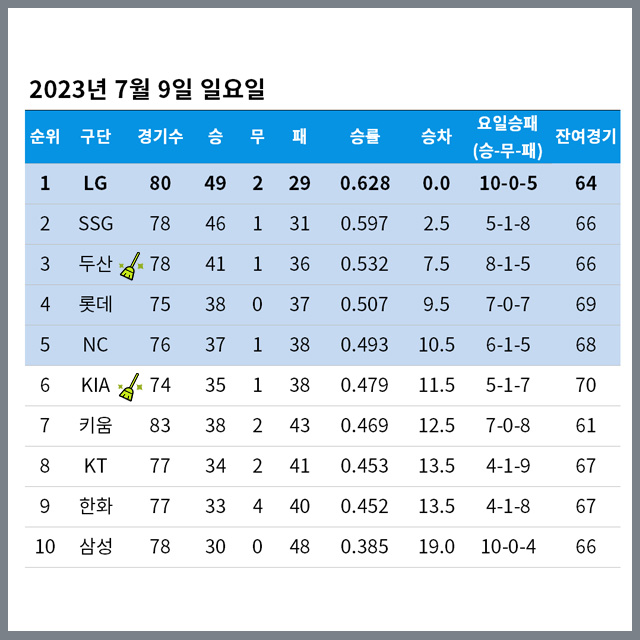 2023년 7월 9일 일요일 정규시즌 순위