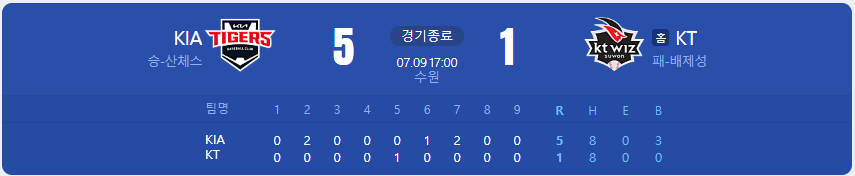 KIA 타이거즈가 KT 위즈를 상대로 5 대 1 승리를 가져갑니다.