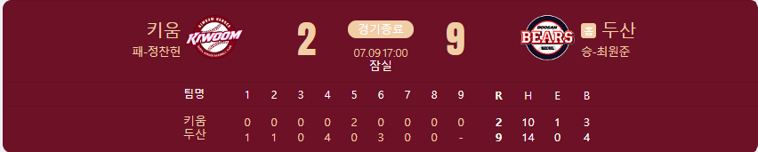 두산 베어스가 키움 히어로즈를 상대로 9 대 2 승리를 가져갑니다.