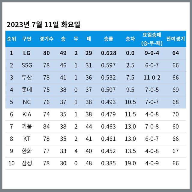 | 230712 수요일 KBO 정규시즌 리뷰 및 순위 확인 (0) | 2023.07.14 |