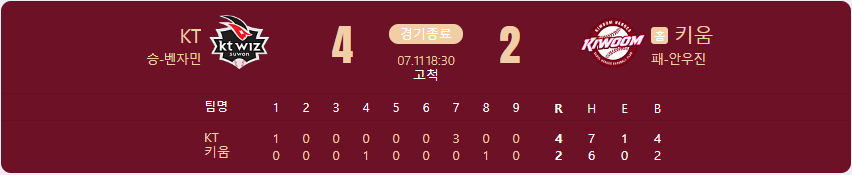 KT 위즈가 키움 히어로즈를 상대로 4 대 2 승리를 가져갑니다.
