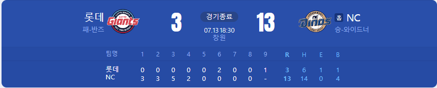 NC 다이노스가 롯데 자이언츠를 상대로 13 대 3 승리를 가져갑니다.