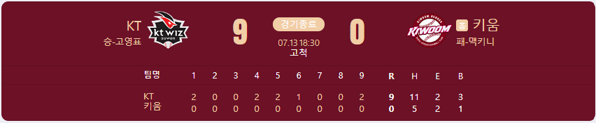 KT 위즈가 키움 히어로즈를 상대로 9 대 0 승리를 가져갑니다.