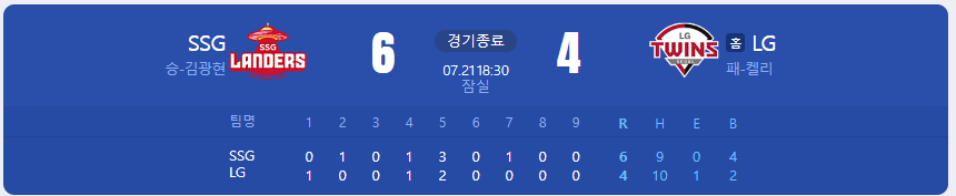 SSG 랜더스가 LG 트윈스를 상대로 6 대 4 승리를 가져갑니다.