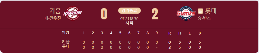 롯데 자이언츠가 키움 히어로즈를 상대로 2 대 0 승리를 가져갑니다.
