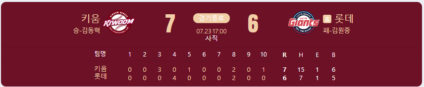 키움 히어로즈가 롯데 자이언츠를 상대로 7 대 6 승리를 가져갑니다.