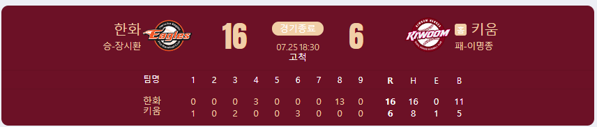한화 이글스가 키움 히어로즈를 상대로 16 대 6 승리를 가져갑니다.