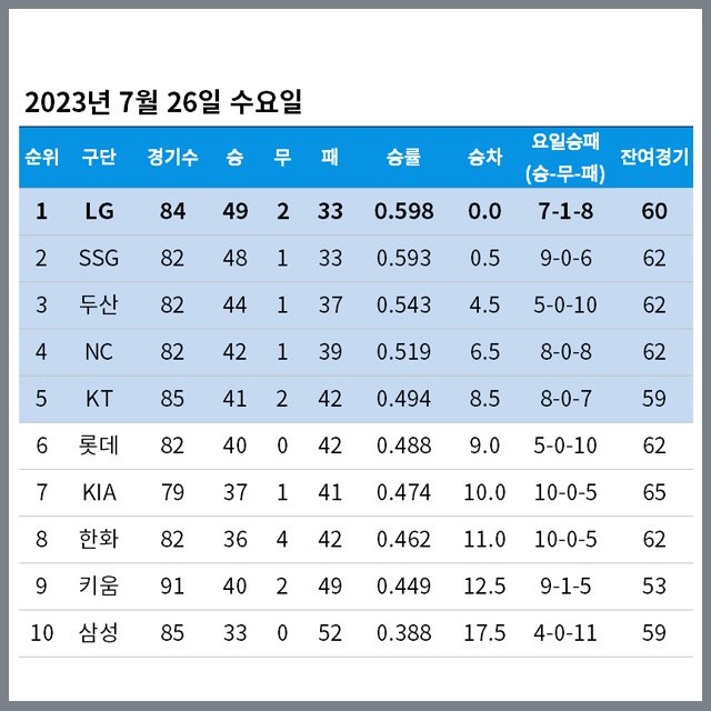2023년 7월 26일 수요일 정규시즌 순위