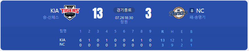 KIA 타이거즈가 NC 다이노스를 상대로 13 대 3 승리를 가져갑니다.