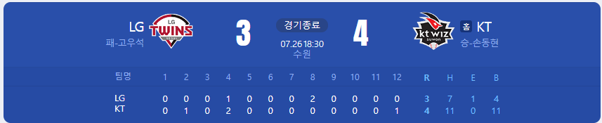 KT 위즈가 LG 트윈스를 상대로 4 대 3 승리를 가져갑니다.