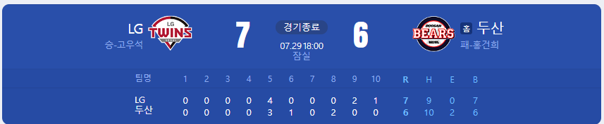 LG 트윈스가 두산 베어스를 상대로 7 대 6 승리를 가져갑니다.
