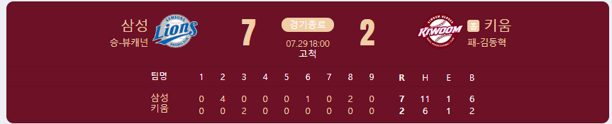 삼성 라이온즈가 키움 히어로즈를 상대로 7 대 2 승리를 가져갑니다.