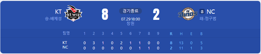 KT 위즈가 NC 다이노스를 상대로 8 대 2 승리를 가져갑니다.