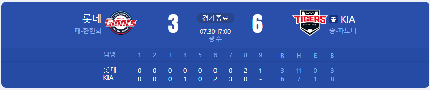 KIA 타이거즈가 롯데 자이언츠를 상대로 6 대 3 승리를 가져갑니다.