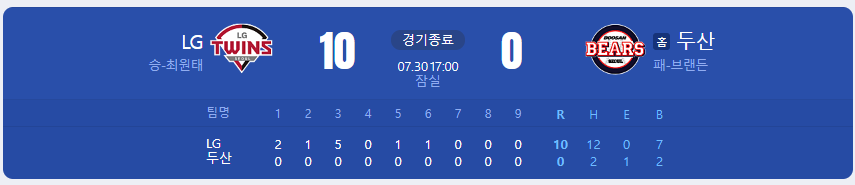 LG 트윈스가 두산 베어스를 상대로 10 대 0 승리를 가져갑니다.