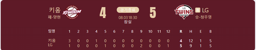 LG 트윈스가 키움 히어로즈를 상대로 5 대 4 승리를 가져갑니다.