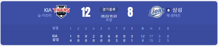 KIA 타이거즈가 삼성 라이온즈를 상대로 12 대 8 승리를 가져갑니다.