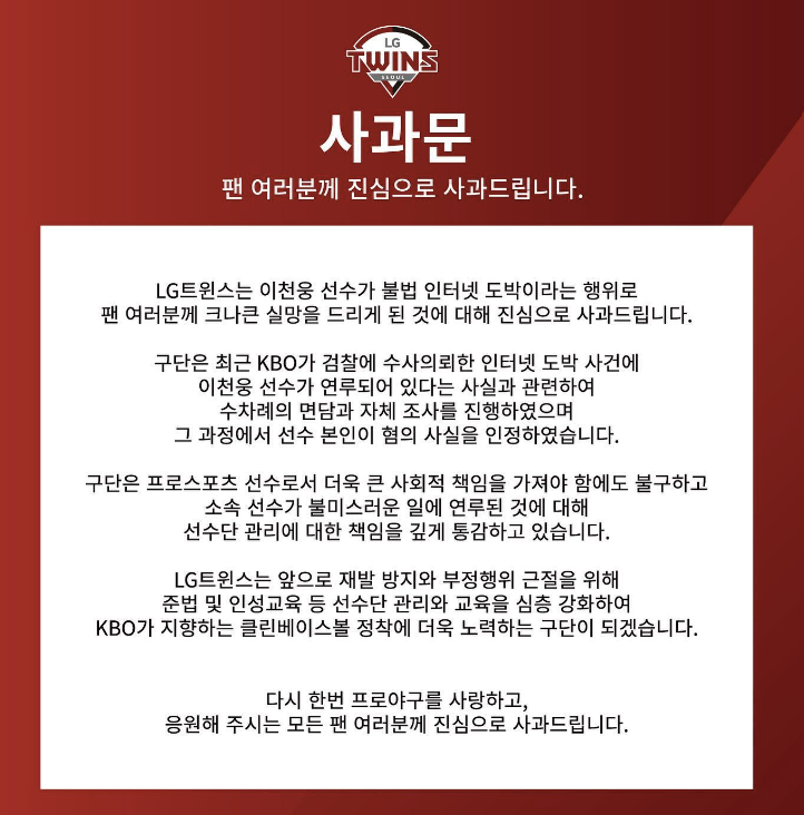 다음은 엘지 트윈스 구단의 사과문 전문입니다.