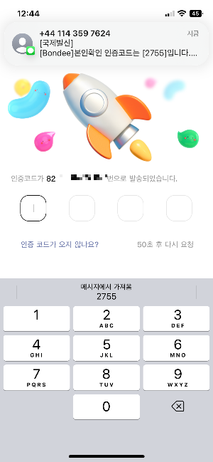 전화번호를 입력해 sms 인증코드를 받아 인증코드를 입력하고